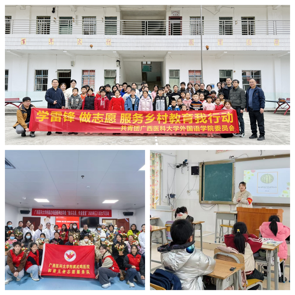 在此次活动中,各学院结合专业优势,开展了丰富多样的志愿服务。医疗服务类活动精彩纷呈,第一临床医学院、第一附属医院开展了学雷锋“志愿服务在医院”暨青年文明号开放周义诊和急救法宣教活动;肿瘤医学院、附属肿瘤医院联合高校开展健康宣讲与免费义诊;武鸣临床医学院、附属武鸣医院在孕妇学校开展培训活动。教育帮扶类活动同样亮点十足,外国语学院师生前往马山县加荣村开展 “学雷锋 做志愿 服务乡村教育我行动”主题活动。此外,还有公益实践类活动,如护理学院组织血车进校园活动,信息与管理学院研究生团支部开展图书馆志愿活动,第二临床医学院、第二附属医院组织主题班会活动,武鸣临床医学院和全科医学院联合开展美育沁润活动。