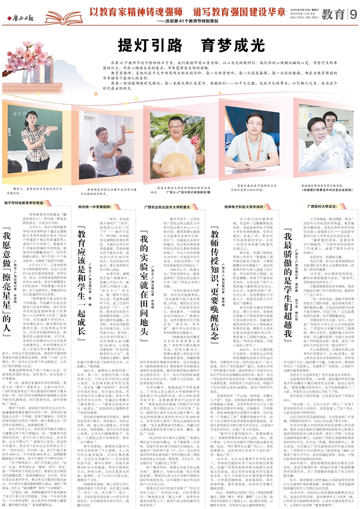 2025.9.10出版的《广西日报》在教师节专版“提灯引路 育梦成光”刊登我校梁浩教授优秀事迹。