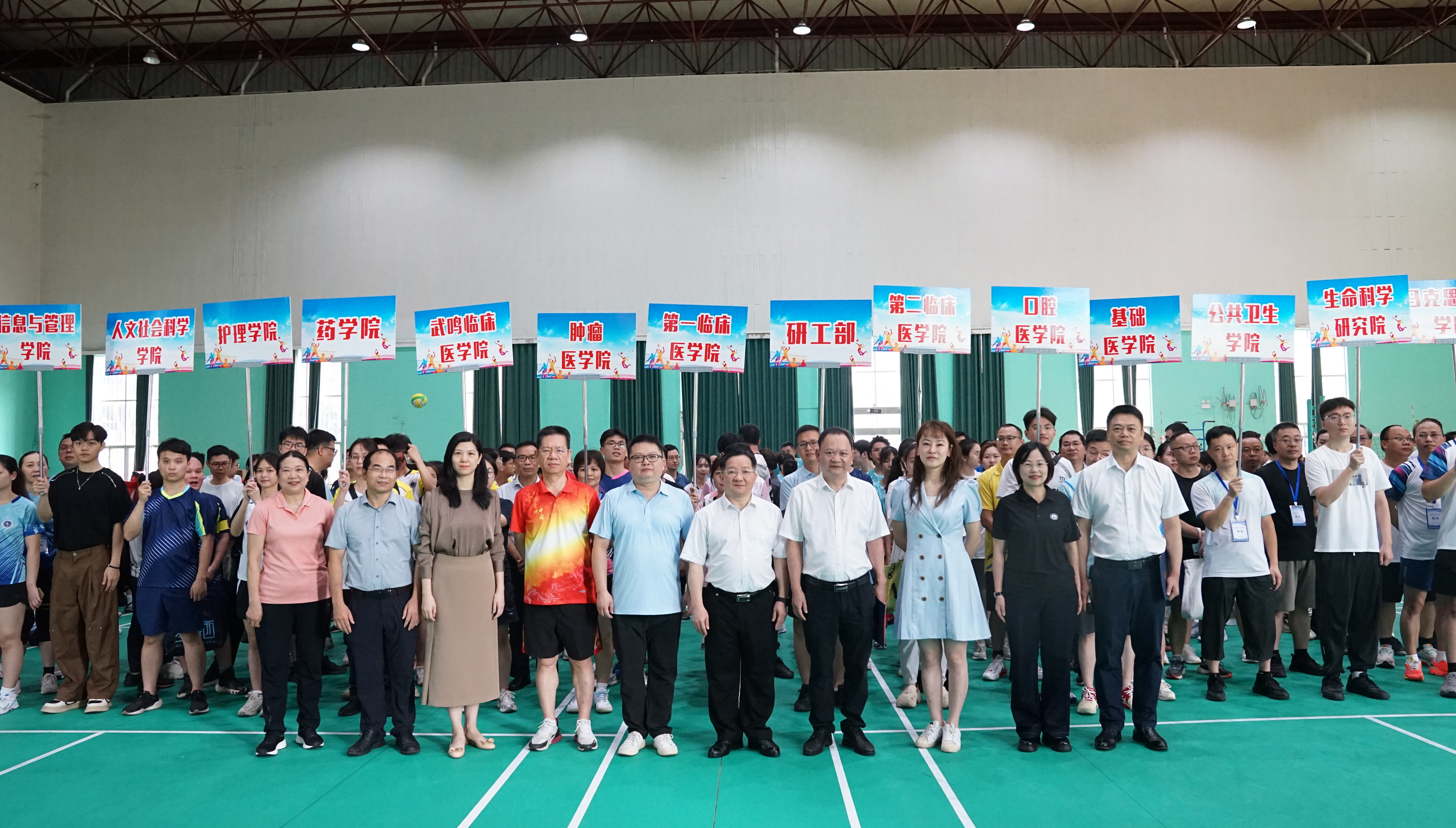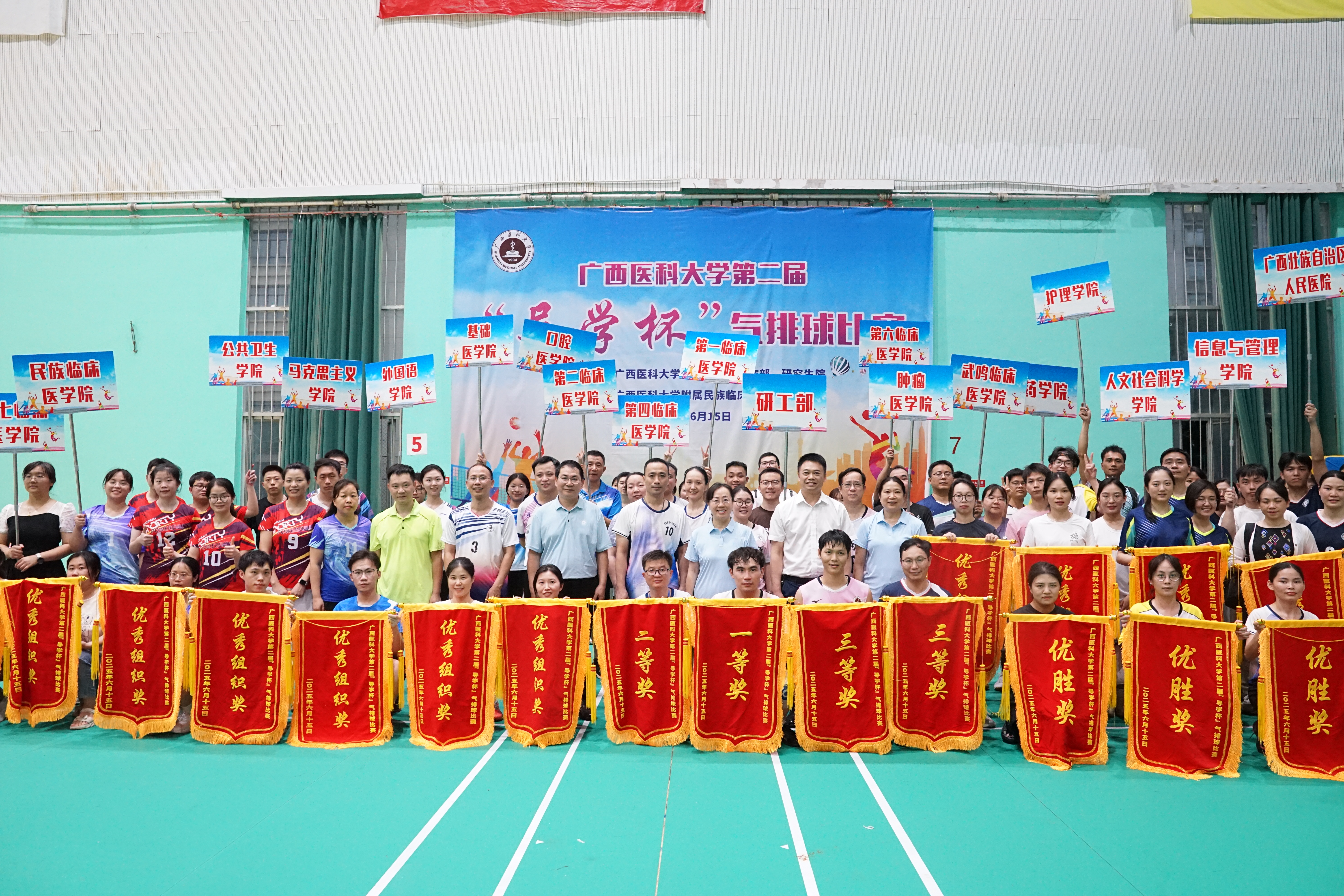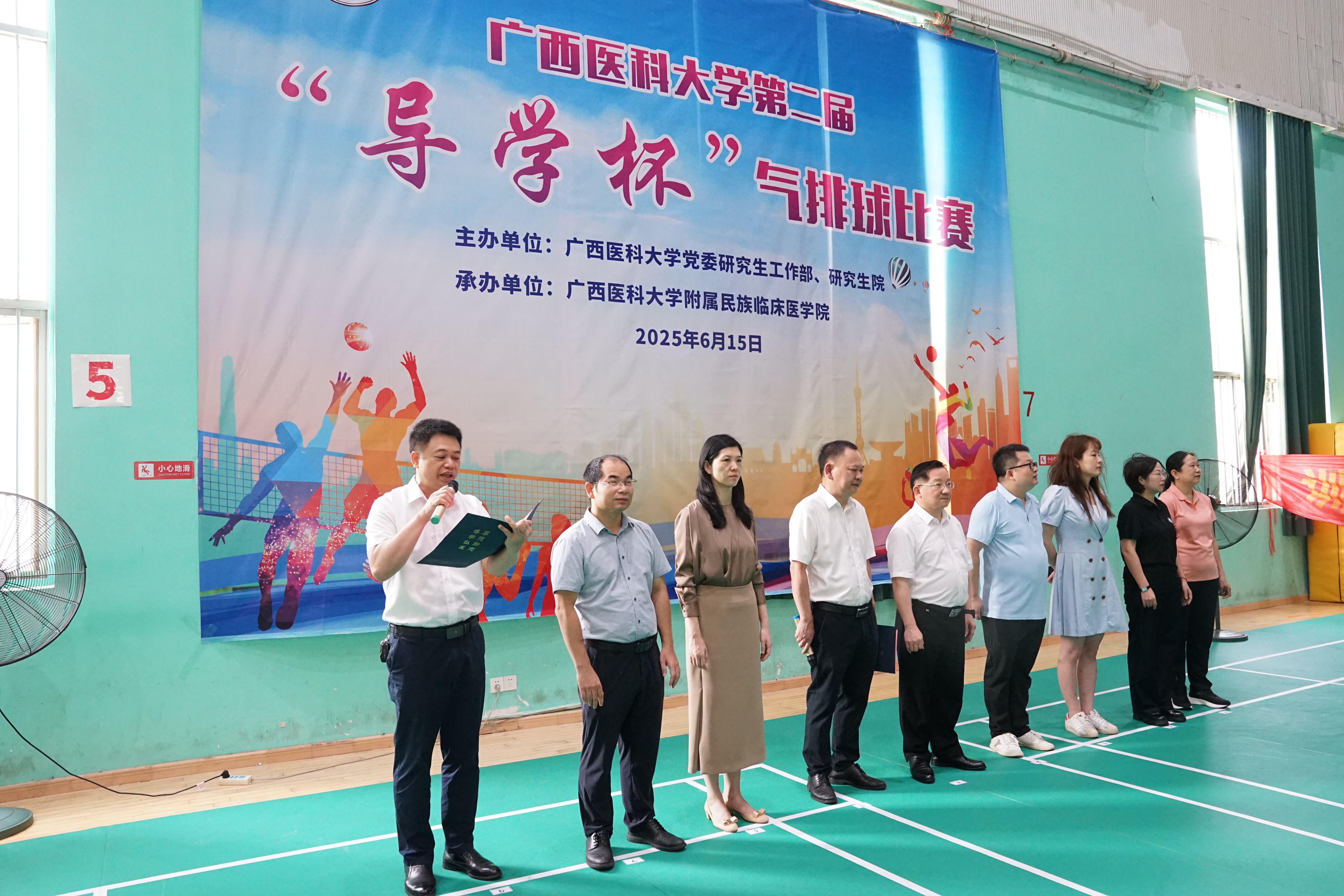 6月15日,我校第二届“导学杯”气排球比赛在校本部风雨球馆举行。学校副校长卢德成出席开幕式,学校部分职能部处领导,各二级学院、研究生培养单位、培养基地管理人员、导师、研究生代表参加。开幕式由民族临床医学院(广西民族医院)副院长周志宇主持。
