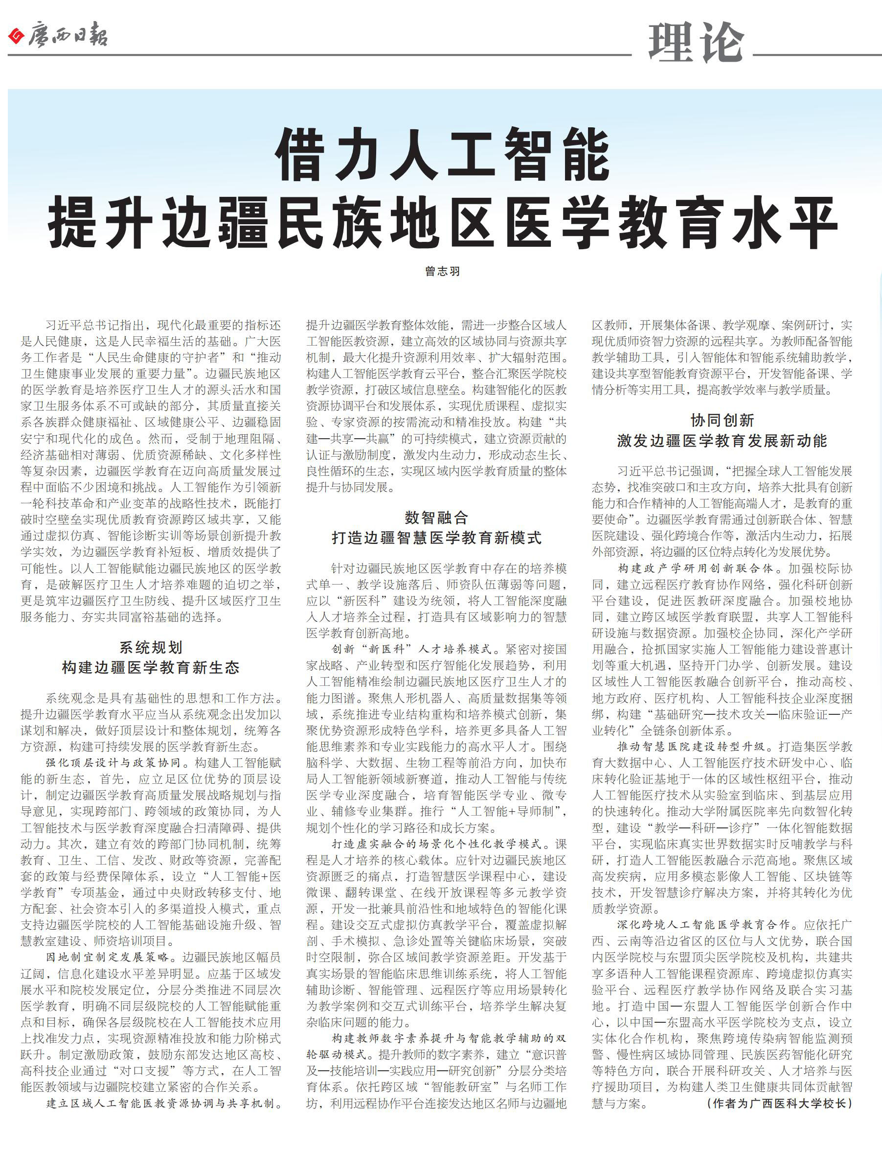 2025年9月16日,《广西日报》第7版刊发我校校长曾志羽理论文章——《借力人工智能 提升边疆民族地区医学教育水平》。文章从系统规划、数智融合、协同创新三个维度,全面阐述了人工智能赋能边疆民族地区医学教育高质量发展的实施路径与战略方案。