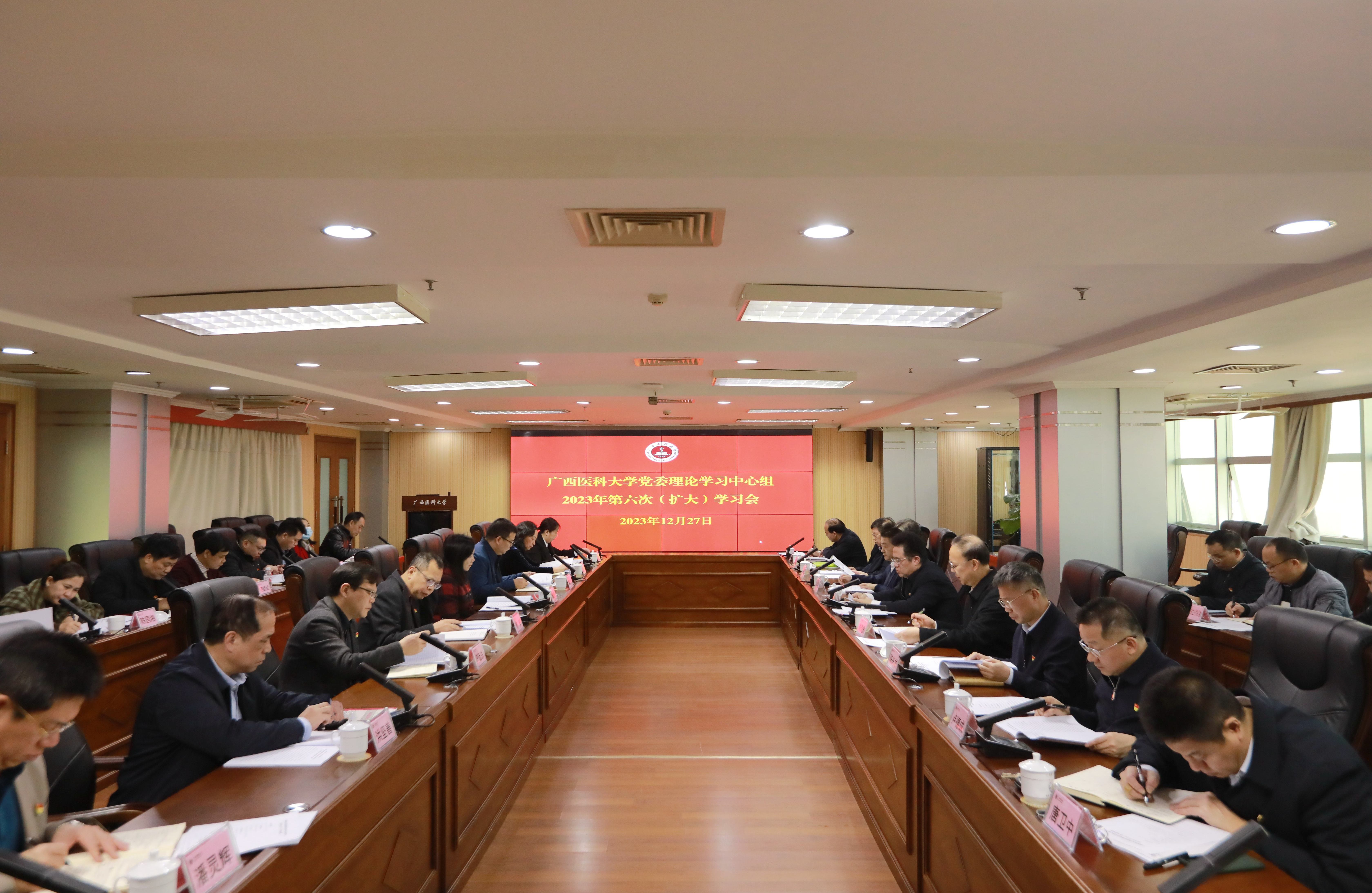 2023年12月27日上午,学校党委理论学习中心组2023年第六次(扩大)学习会在南宁-校本部综合楼14楼会议室召开。本次会议的主要任务是:深入学习贯彻习近平文化思想,守正创新开创学校宣传思想文化工作新局面,为学校高质量发展和“双一流”建设凝聚精神力量。