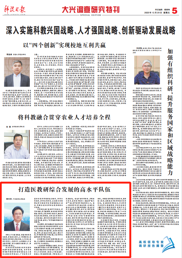 12月29日,科技日报5版“大兴调查研究特刊”摘登深入实施科教兴国战略、人才强国战略、创新驱动发展战略专题,宣传教育领域大兴调查研究的思路举措、进展成效和成果经验。刊发我校校长曾志羽调研文章《打造医教研综合发展的高水平队伍》。敬请关注!