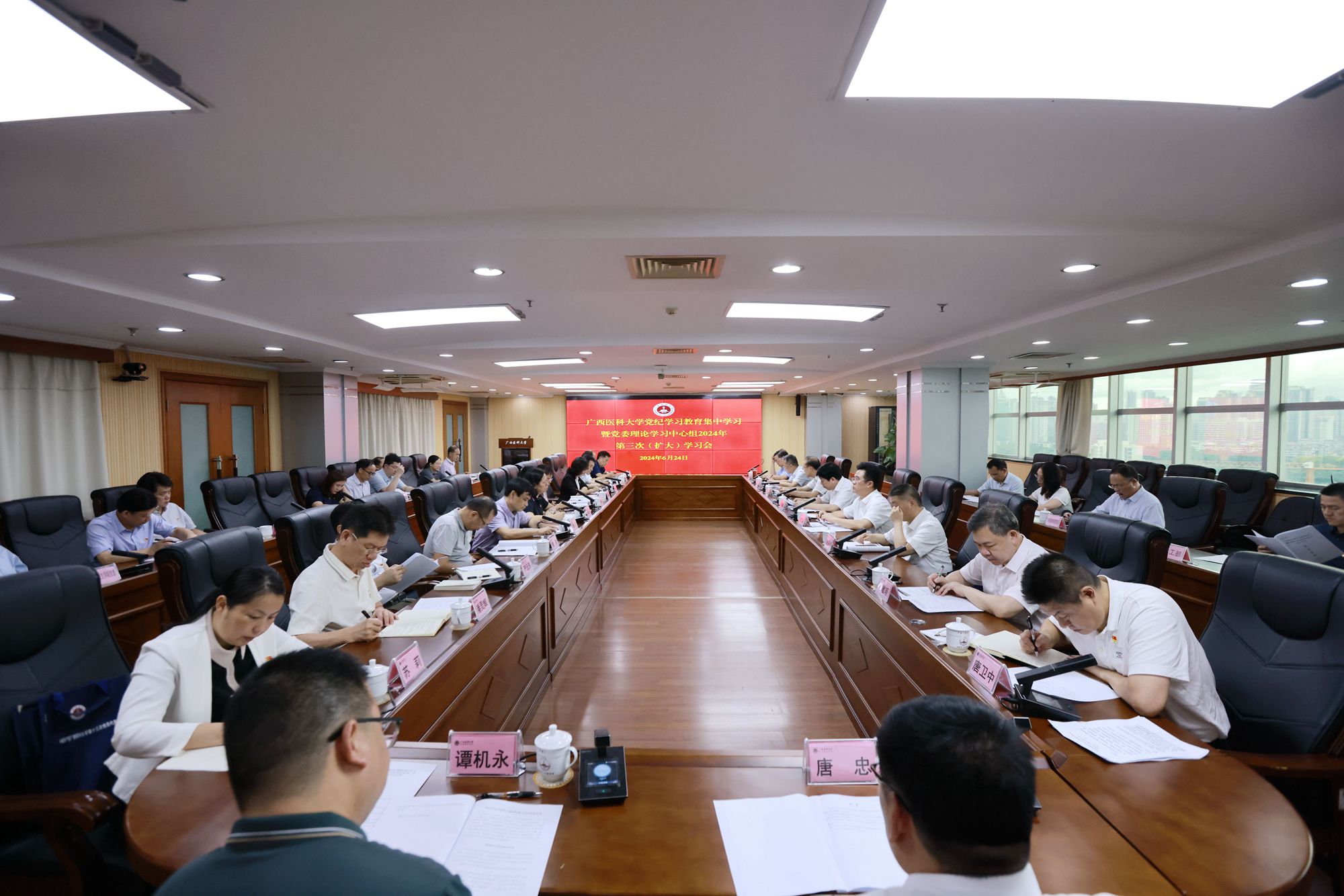 6月24日下午,学校党纪学习教育集中学习暨党委理论学习中心组2024年第三次(扩大)学习会在南宁-校本部综合楼14楼会议室召开。会议跟进学习习近平总书记重要讲话精神,并围绕廉洁纪律和群众纪律开展党纪学习教育集中学习研讨。校党委书记黄照权主持并讲话。学校党委常委、委员等参加会议。