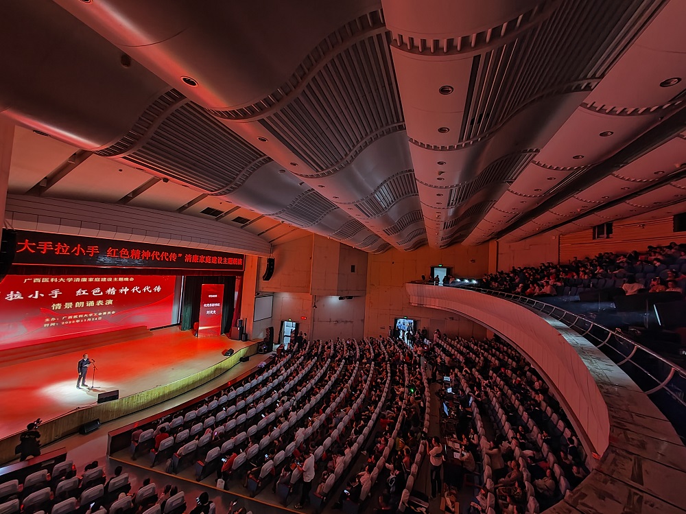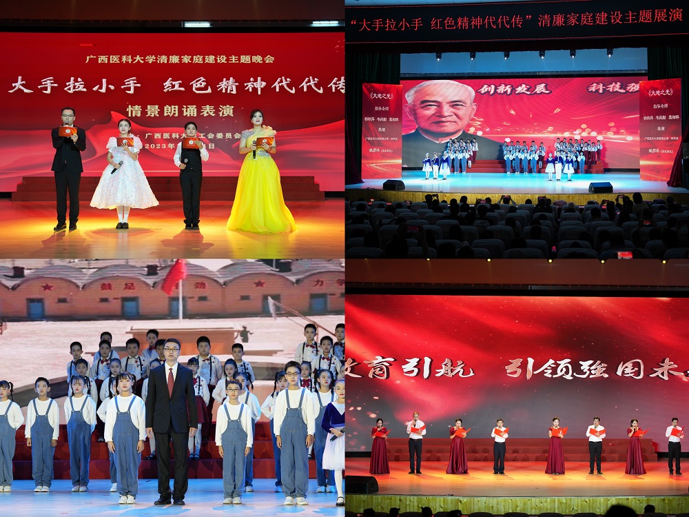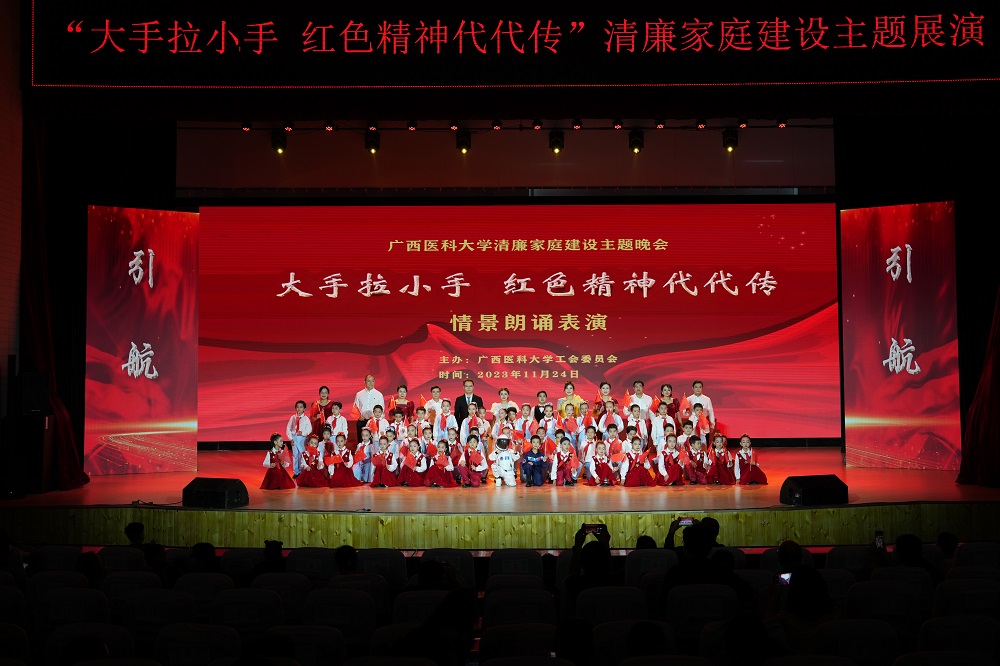 为全面推进清廉医大建设,由学校工会主办的清廉家庭建设主题晚会——“大手拉小手 红色精神代代传”情景剧朗诵表演于11月24日晚在校本部图书馆演讲厅举行,附属小学全体师生、家长代表及幼儿园部分师生代表共同参加演出。学校党委副书记刘灵光出席活动。