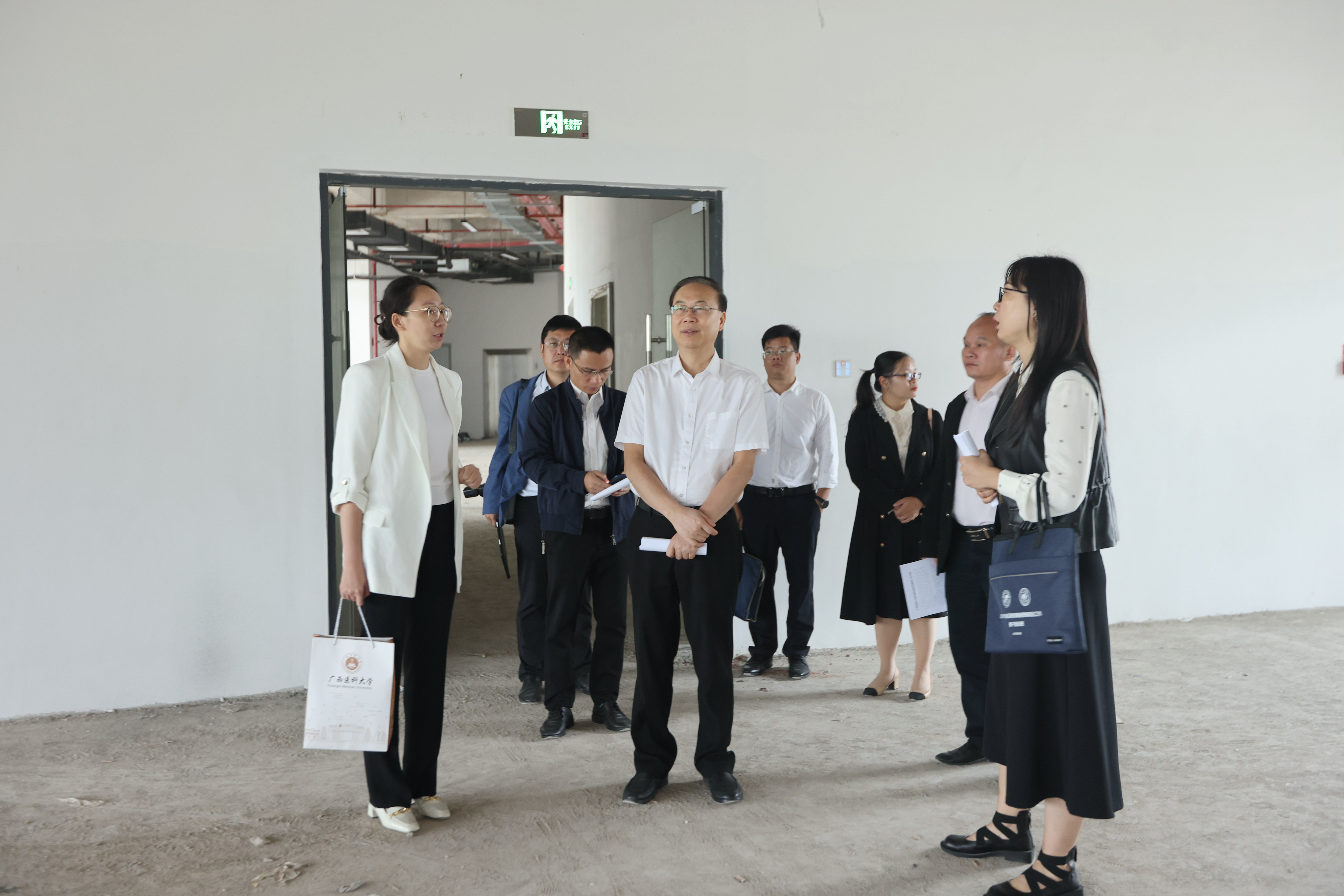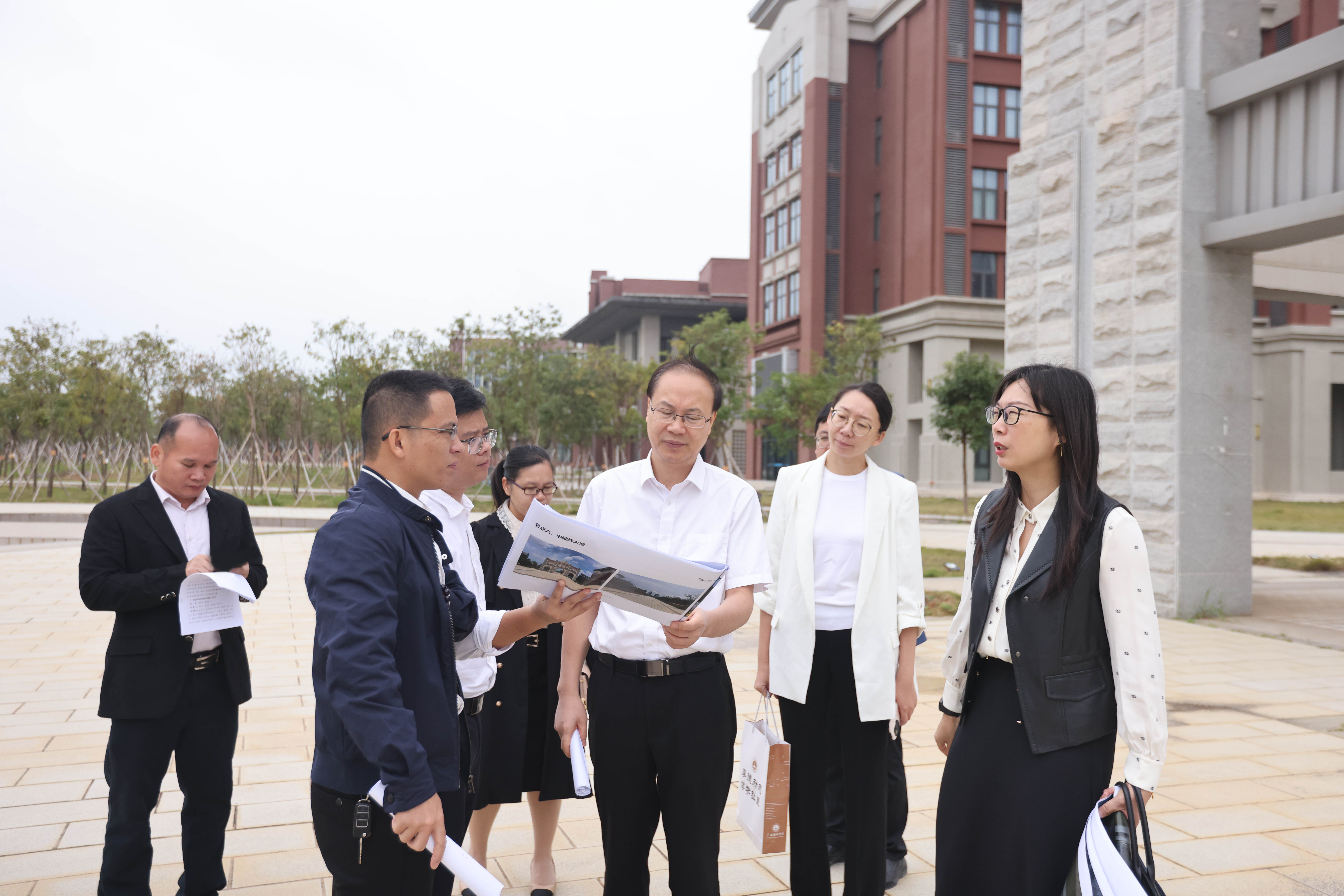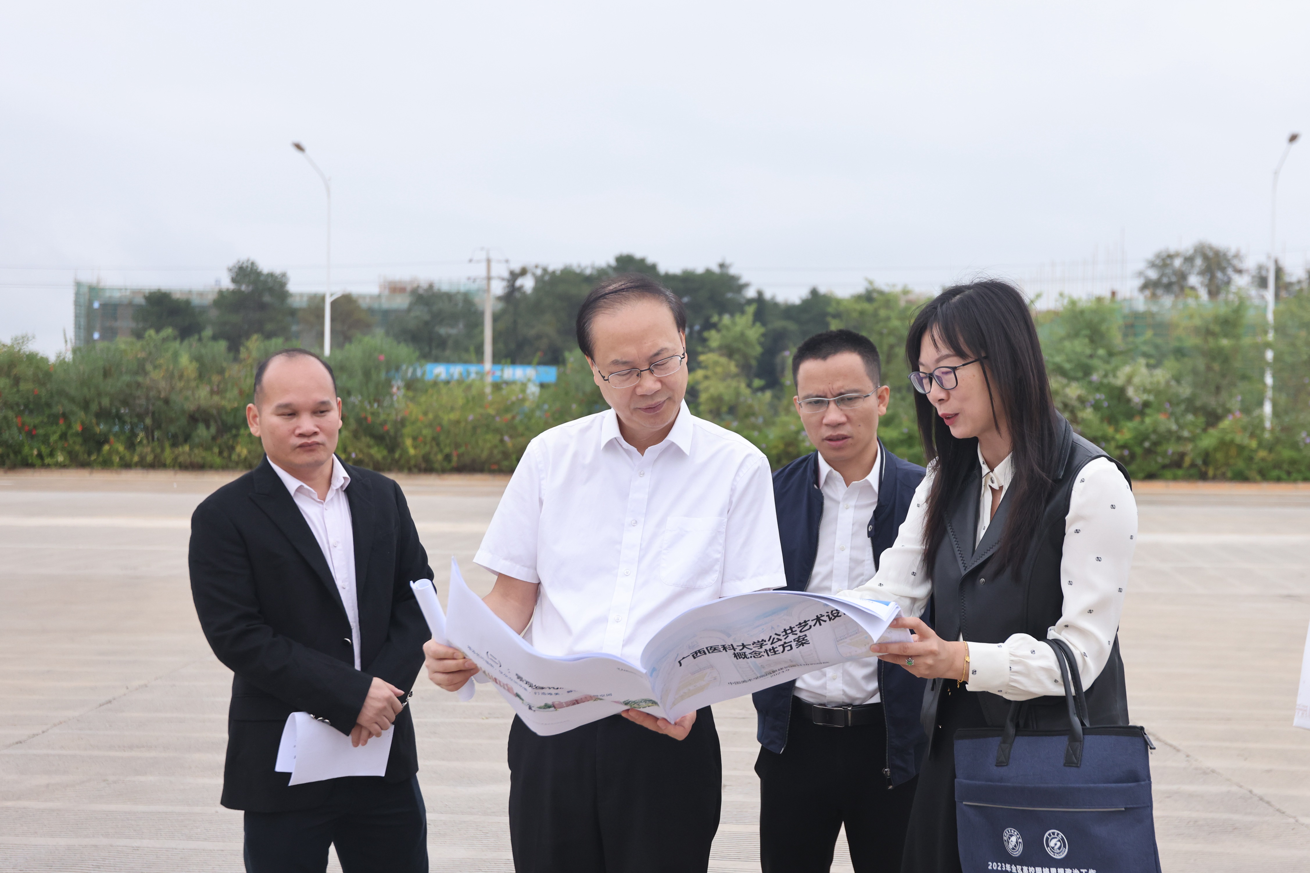 为确保校庆各项工作进一步推进,10月12日上午,学校党委副书记刘灵光带队赴武鸣校区调研校史馆及校园景观工程项目建设。