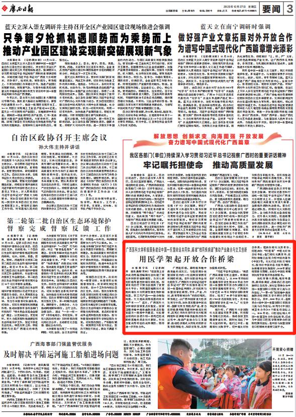 12月27日,广西日报003版要闻“解放思想 创新求变 向海图强 开放发展 奋力谱写中国式现代化广西篇章”专栏报道我校聚焦肝癌、鼻咽癌和地中海贫血等包括部分东盟国家在内的一些亚洲国家高发疾病,深化拓展与东盟国家在医学研究、国际教育与交流,为服务构建更为紧密的中国—东盟命运共同体贡献力量。敬请关注!