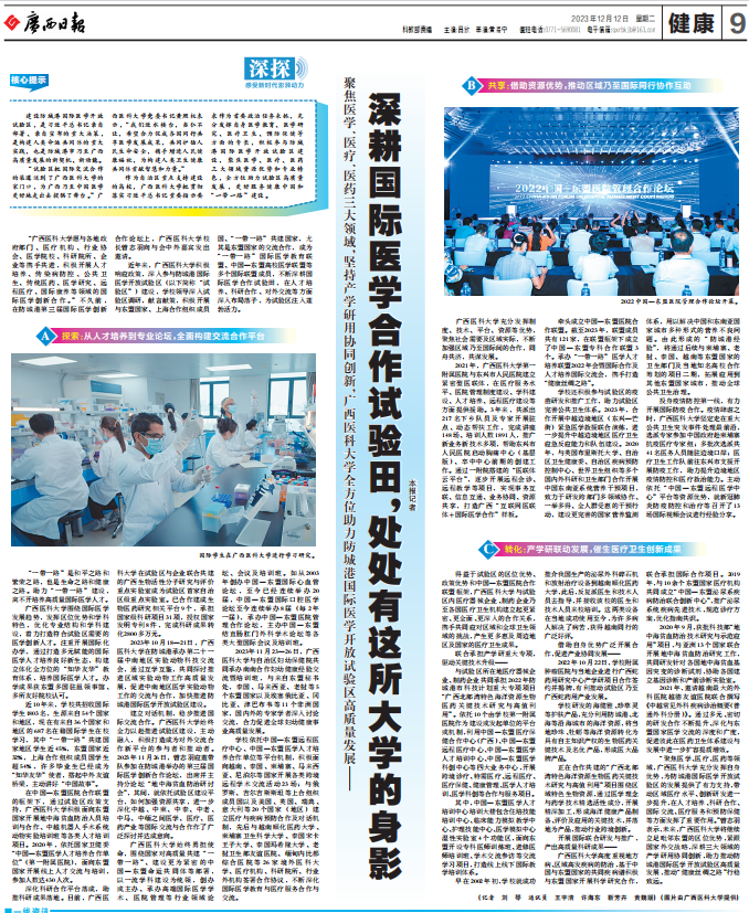 2023年12月12日,《广西日报》在9版健康版专题报道我校深耕国际医学合作试验田,聚焦医学、医疗、医药三大领域,坚持产学研用协同创新,全方位助力防城港国际医学开放试验区高质量发展。敬请关注!